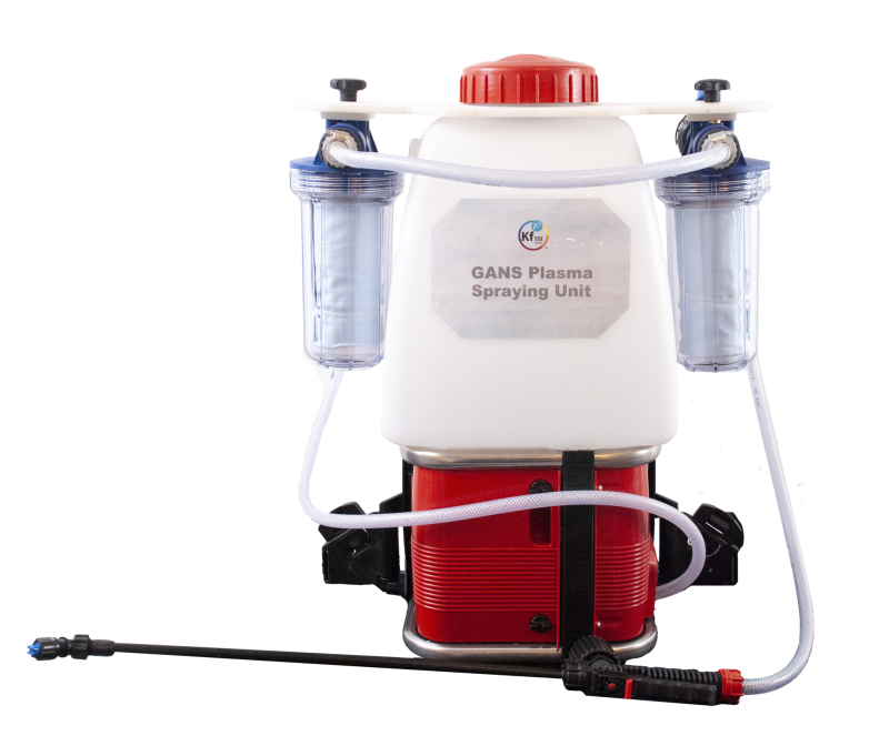 De GANS Plasmaspuitunit bestaat uit een watertank van 20 liter, een pomp op Li-Ion-batterij, twee vervangbare GANS-plasmakamers, een spuitbuis met twee spuitmogelijkheden, een draagbaar rugzakframe en een manometer. De op batterijen werkende waterpomp zuigt water uit de watertank en duwt aan de andere kant het water naar de twee GANS-plasmakamers. Het leidingwater dat in de GANS-plasmakamers wordt geperst, wordt op plasmabasis gefilterd door het gebruik van GANS-plasmapatronen in de kamers. Het GANS Plasma gefilterde water gaat vervolgens door een mechanisch filter en vervolgens door de kop van de sproeibuis en kan direct worden gebruikt om de omgeving te besproeien. GANS Plasmacartridges moeten regelmatig worden vervangen en kunnen afzonderlijk worden besteld.